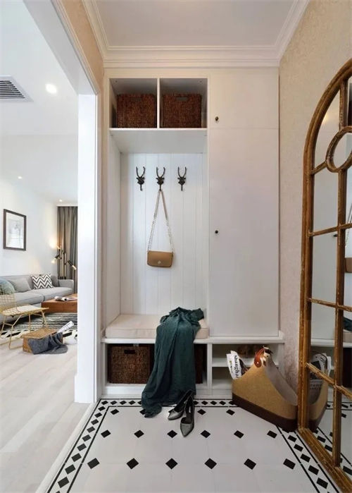 沿垂直于入戶門的墻面做一排鞋柜,要是入戶門位置到了墻角,厚度不夠的話,就選比較薄的成品鞋柜;再要不行,在墻面能敲的情況下,就敲墻吧,然后把鞋柜嵌進去。