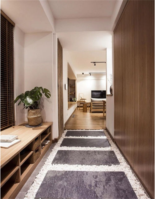這是最常見的設計,在進門處有類似走廊的小空間,設計一個嵌入式玄關,將其沿著墻一排擺放,收納儲物充足,建議設計成I型。