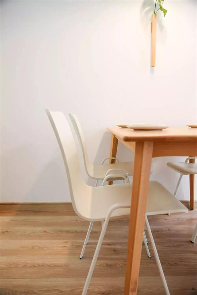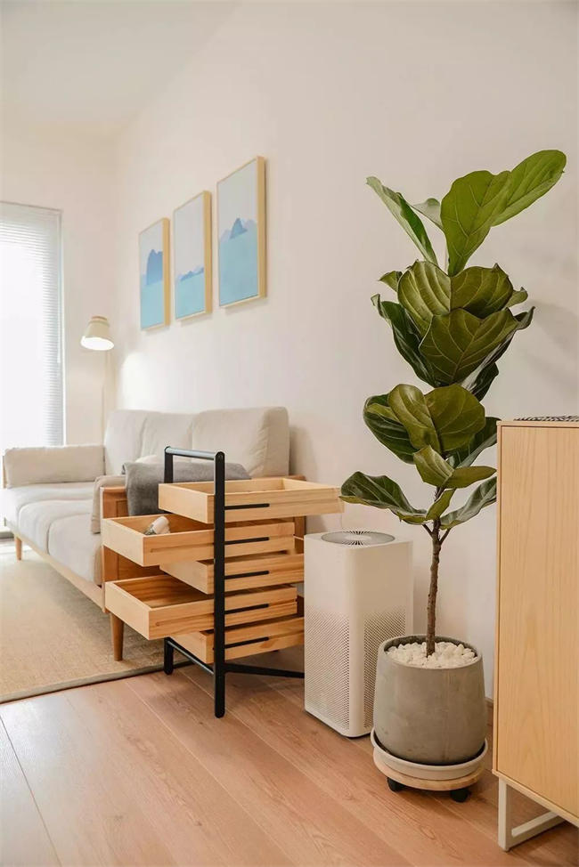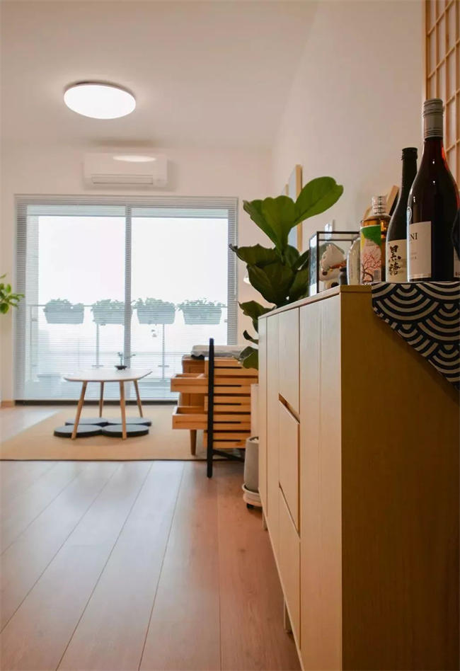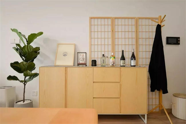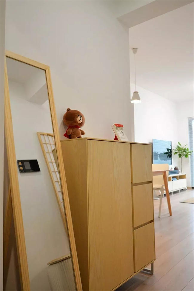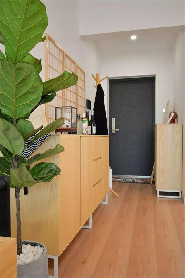 ▲ 玄關(guān)用原木收納柜+原木地板,整個(gè)空間充滿原木的氣息,搭配大株綠植裝飾,入戶就給人清新的感覺。