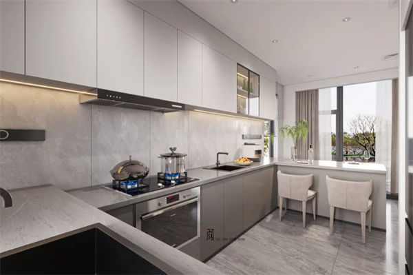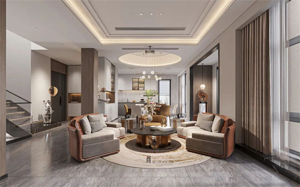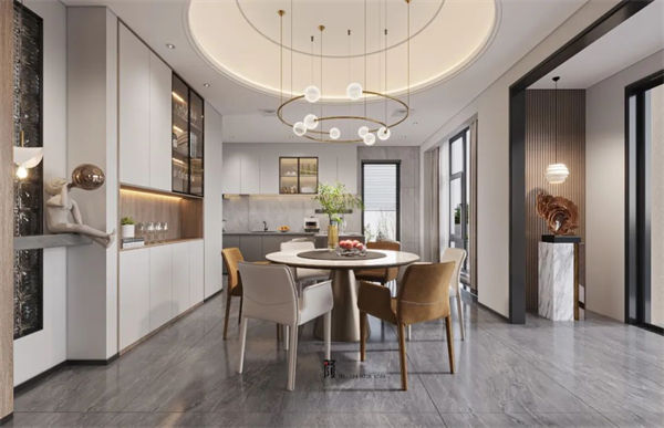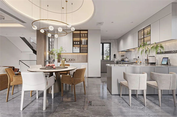 以米白、大地色為基調(diào),搭配淺色系的裝飾,在低調(diào)中盡顯奢華,櫥柜尾部設(shè)計(jì)了一個休閑區(qū),正對前面的落地窗,在細(xì)節(jié)里透露著對生活的精致。不同材質(zhì)的紋理和色彩相互融合且對比,增強(qiáng)了空間畫面感,蜿蜒靈動的弧形吊頂豐富空間的層次,令人完全放松下來并享受充滿濃烈的家庭氛圍中