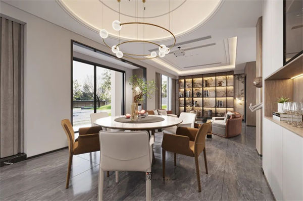 客廳整體以淡雅從容的格調(diào),展現(xiàn)生活的悠閑與舒適,同時把餐廳客廳打造成一個整體,在大面積落地窗的照射下,簡潔而不失大氣,圍合式的沙發(fā),精致的配飾,營造出典雅素凈的會客空間,整體布局滿足基本功能的同時又彰顯一種獨(dú)特的隨性之美。設(shè)計(jì)師以自然而然的手法糅合簡約的基底和寧靜的色彩,為進(jìn)入空間的人掠去心中浮躁,回歸真實(shí)自我。