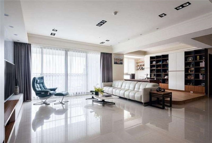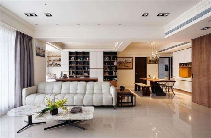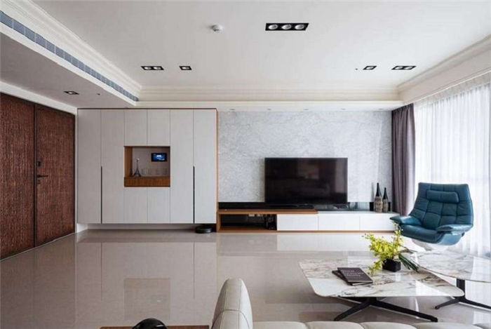 客廳大氣簡(jiǎn)約,收納充足不做滿 屋主不喜歡太多復(fù)雜的設(shè)計(jì),因此歐德設(shè)計(jì)師葛娜麗以大理石拼貼黑鏡為客廳電視主墻,彰顯屋主的大氣品味,入口不做獨(dú)立玄關(guān),而以白色搭配柚木色的系統(tǒng)柜充實(shí)鞋子與衣物的收納,中央以中空臺(tái)面打造畫框意象,生活小物與對(duì)講機(jī)、開關(guān)彷彿都成為畫中一景。