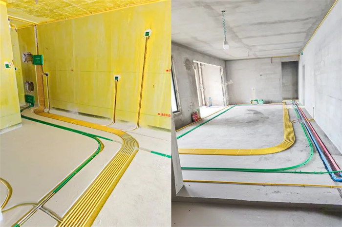 △強(qiáng)弱電線管交叉,強(qiáng)電黃色、弱電綠色不允許混用,弱電線管整齊纏繞錫箔紙