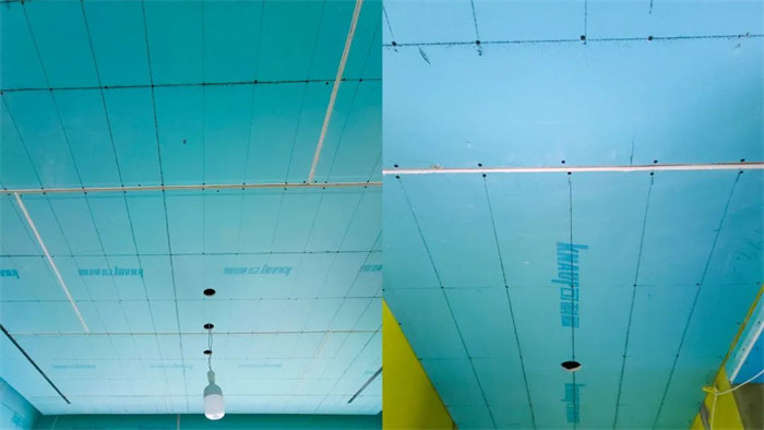 △吊頂平梁,梁下過一層石膏板,厚度10mm,縫隙用發(fā)泡膠軟連接,
