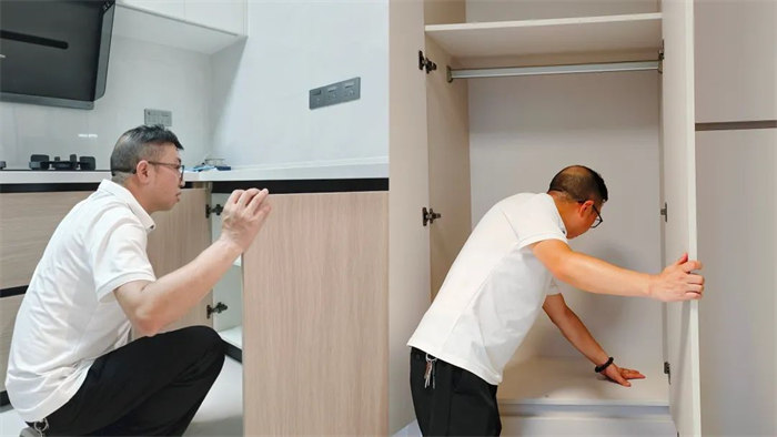 △我們的監(jiān)理正在對屋內(nèi)的定制櫥柜、衣柜進行檢查,確認柜體是否水平垂直,