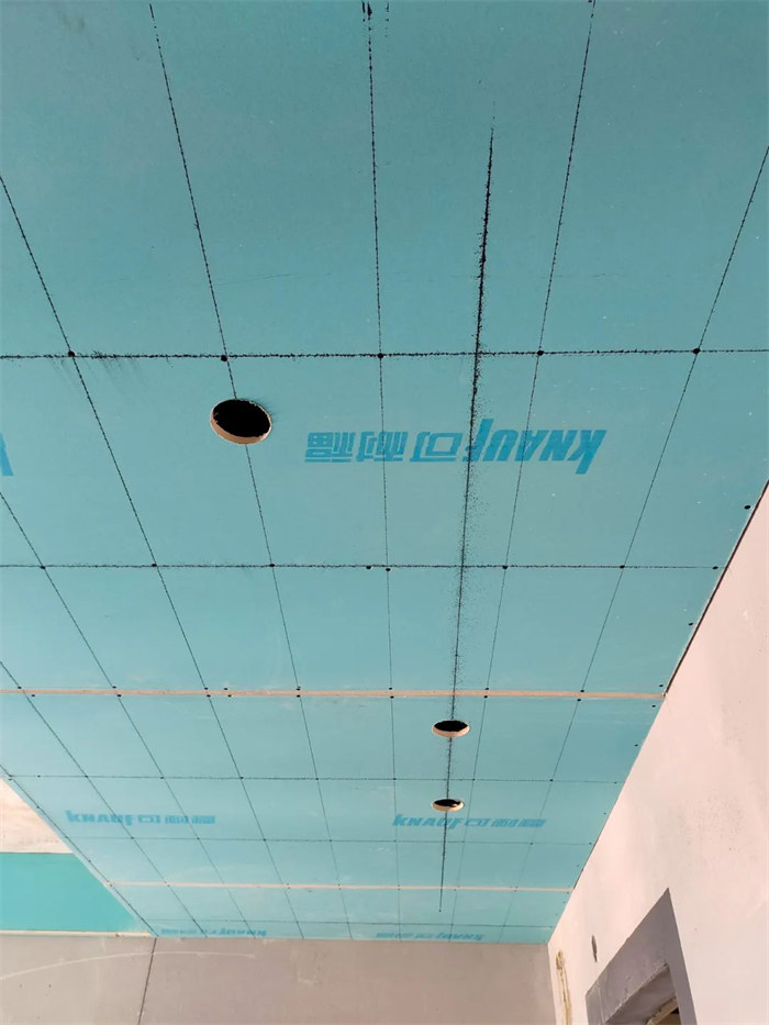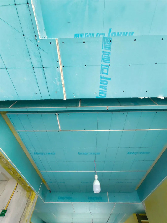 主龍骨的間距為800mm,墻邊距離200-300mm,吊棚外延口邊龍骨橫豎交叉時必須采用搭接及三角斜拉鉚固,吊筋與主龍骨銜接穩(wěn)固無松動;吊頂平梁,梁下過一層石膏板,厚度10mm,縫隙用發(fā)泡膠軟連接,所有石膏均要求切割平直,陽角不允許用石膏板原邊,合格。