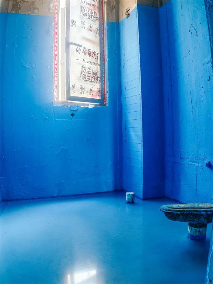 △衛(wèi)生間防水涂層均勻覆蓋在地面,施工無漏刷破損。