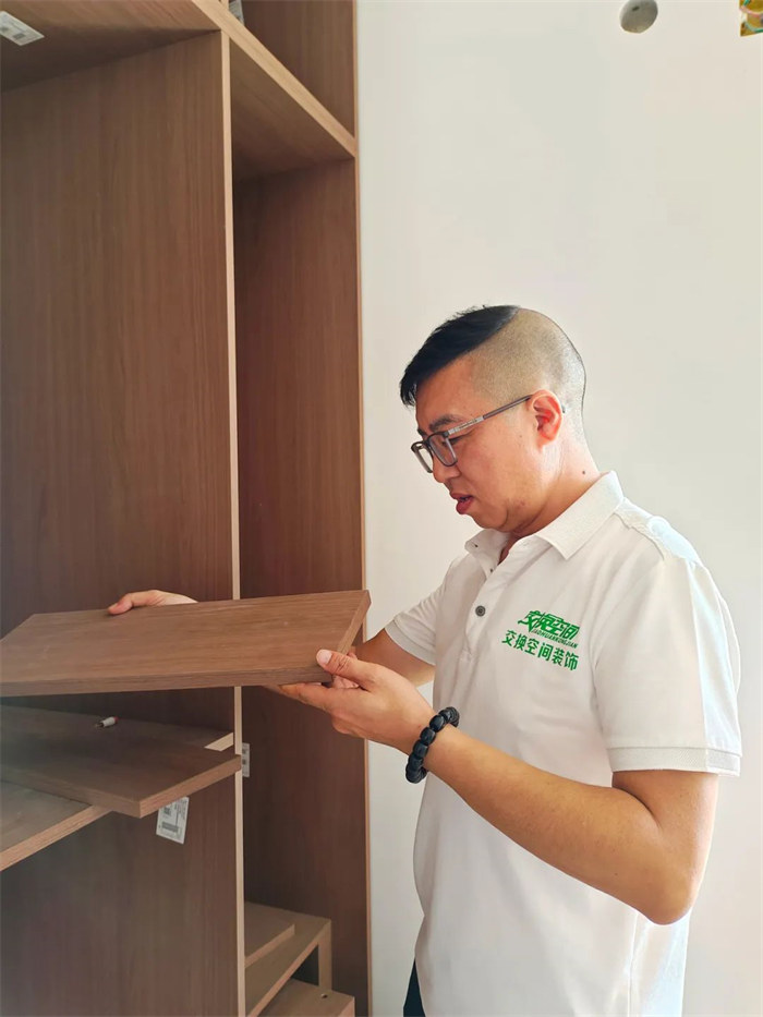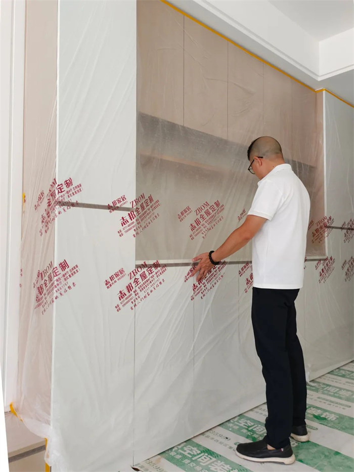 這是我們的監(jiān)理正在對屋內(nèi)定制柜進行檢查,確認柜體是否水平垂直,五金配件安裝牢固。檢查內(nèi)部隔板平整,無松動。確保柜體表面無劃傷、瑕疵,安裝穩(wěn)固。