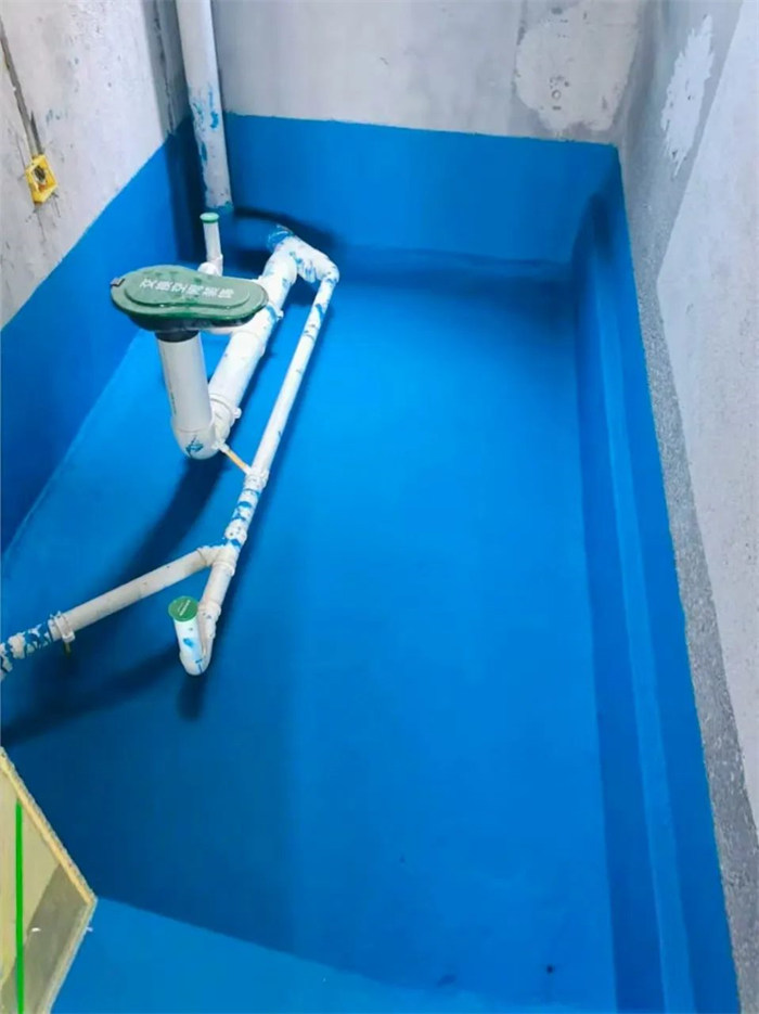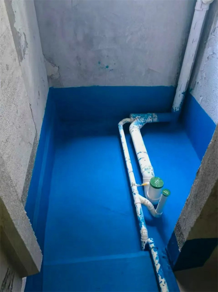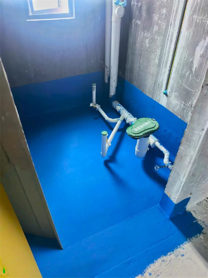 △衛(wèi)生間防水涂層均勻覆蓋在地面,施工無(wú)漏刷破損。