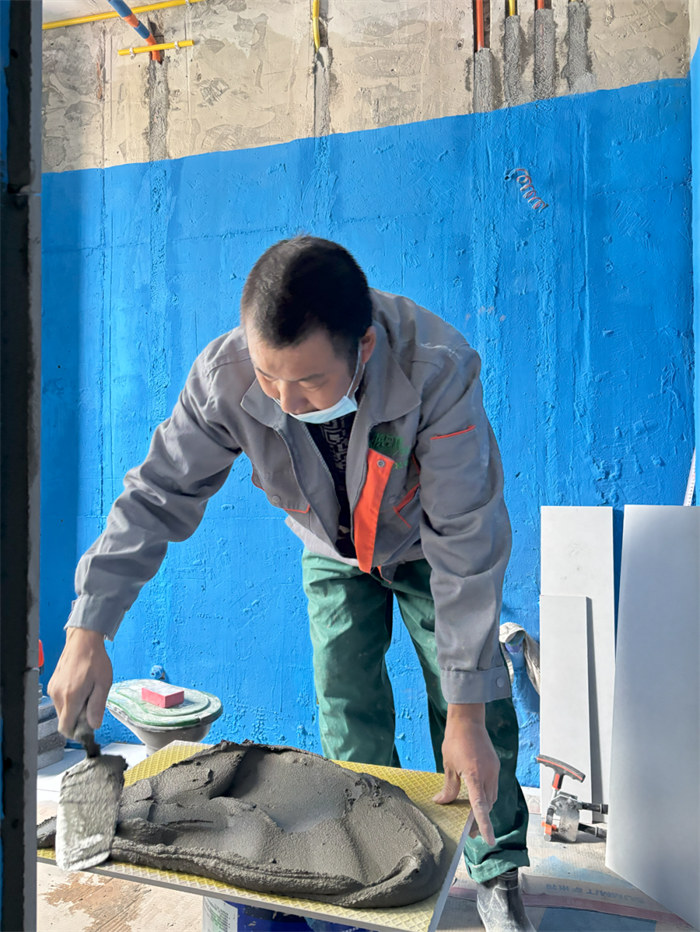 △我們的瓦工師傅正在認真調配瓷磚膠,每一個動作都藏著對品質的較真。師傅要把瓷磚膠攪拌均勻、厚薄一致,這樣能讓瓷磚與基層牢牢貼合,避免空鼓、脫落的隱患。
