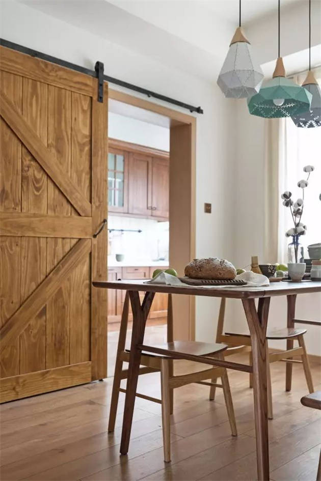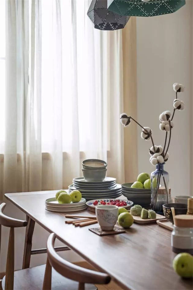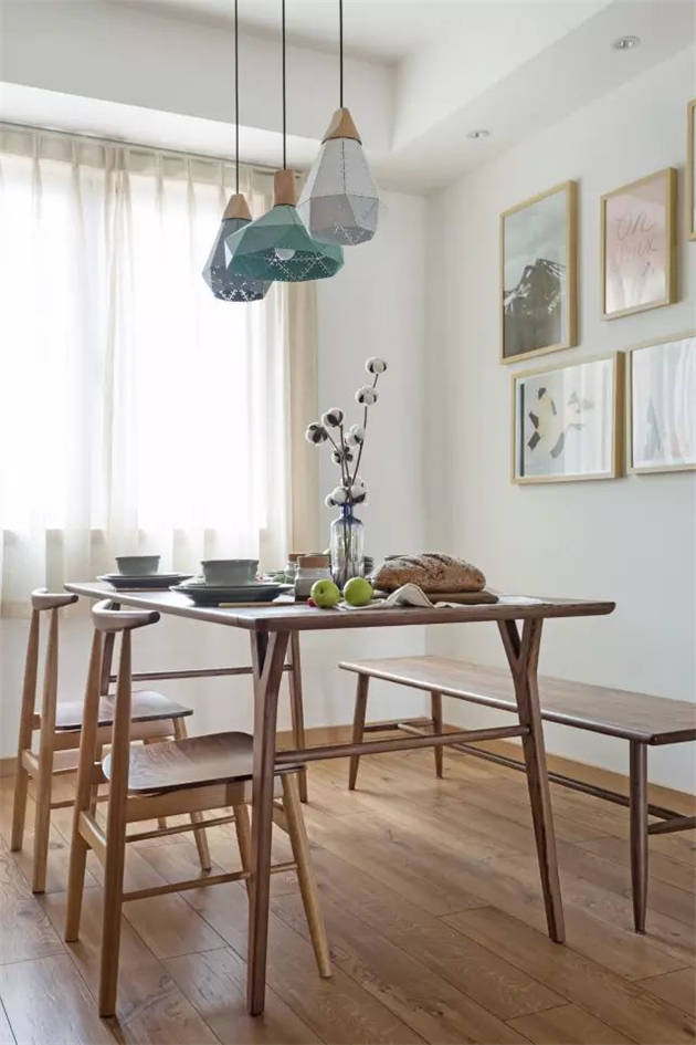 別致的原木桌椅提升整個空間的質(zhì)感。薄荷綠和淺藍綠的吊燈,讓人眼前一亮。