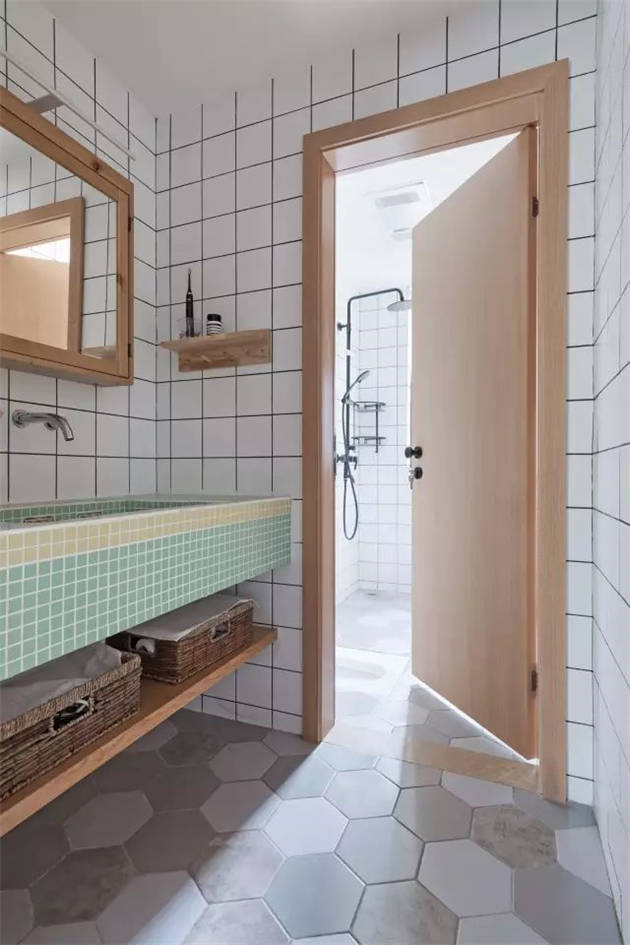 衛(wèi)生間進行了干濕分區(qū),盥洗臺配以糖果色馬賽克瓷磚,清新明亮。