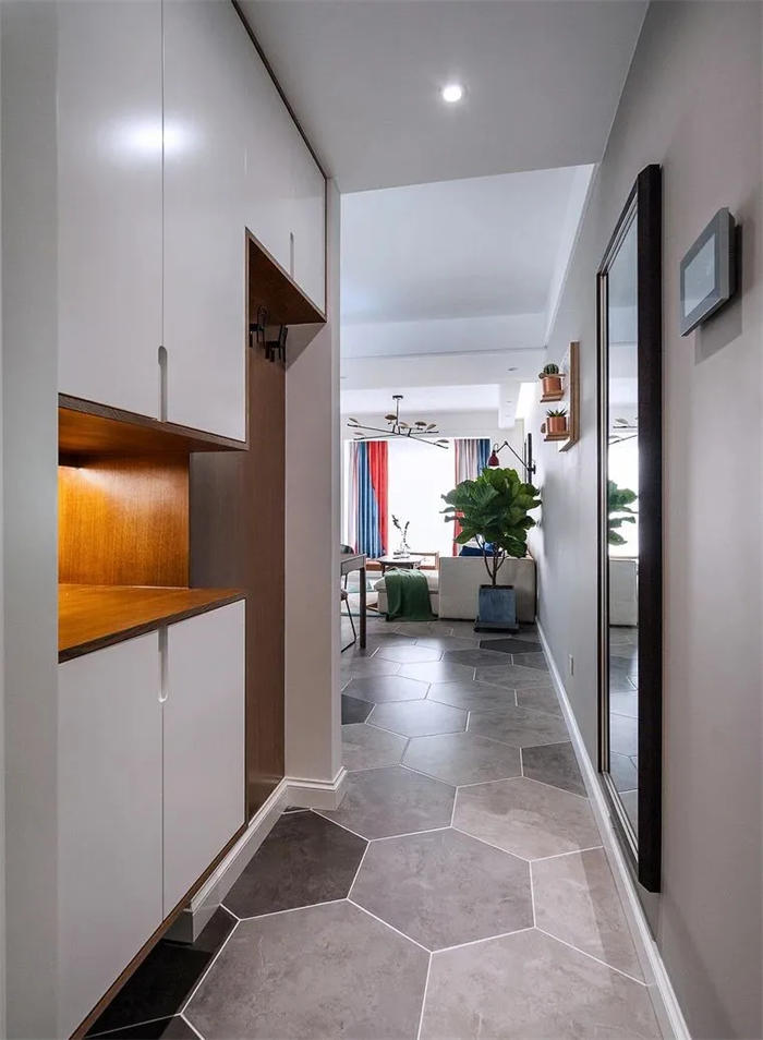 這是最常見的設(shè)計(jì),在進(jìn)門處有類似走廊的小空間,設(shè)計(jì)一個(gè)嵌入式玄關(guān),將其沿著墻一排擺放,收納儲(chǔ)物充足,建議設(shè)計(jì)成I型。