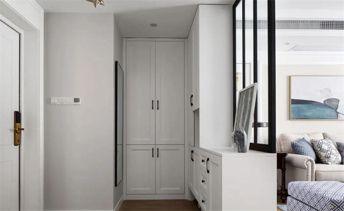 沿垂直于入戶門的墻面做一排鞋柜,要是入戶門位置到了墻角,厚度不夠的話,就選比較薄的成品鞋柜;再要不行,在墻面能敲的情況下,就敲墻吧,然后把鞋柜嵌進(jìn)去。