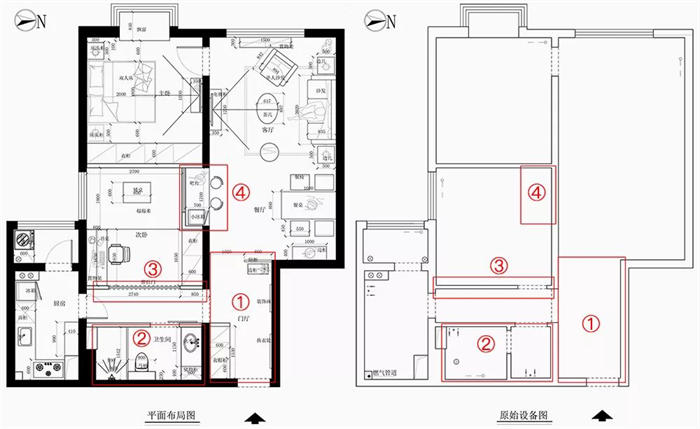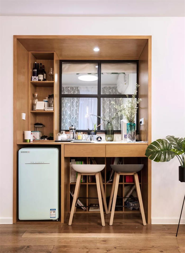 ▲客廳電視墻旁邊把非承重墻打掉,裝了個(gè)入墻式的辦公區(qū),通過(guò)室內(nèi)窗做隔斷,也為客餐廳區(qū)域提供了采光,是個(gè)非常巧妙的小設(shè)計(jì)。