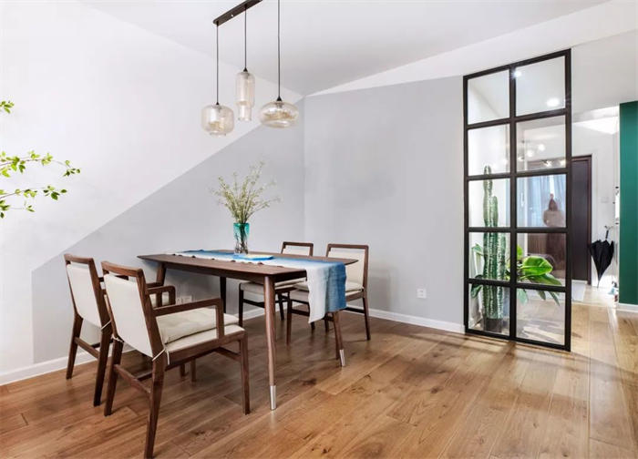 ▲餐廳的墻面在大白墻的基礎(chǔ),以淺灰的乳膠漆做了個(gè)陰影處理,讓空間顯得更加有層次感。極簡(jiǎn)實(shí)木餐桌椅,搭配上3盞暖色調(diào)的吊燈,呈現(xiàn)出一個(gè)溫馨自然的空間。