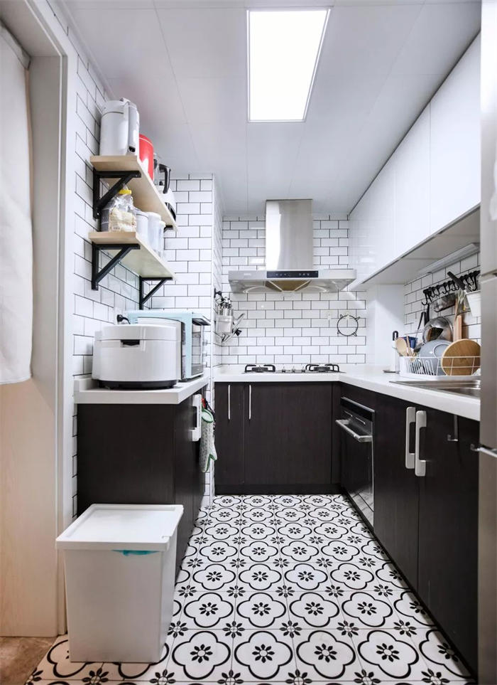 ▲廚房地面貼著梅花圖案的地磚,結(jié)合上深色的櫥柜,呈現(xiàn)出一個(gè)文藝時(shí)尚的空間感。豐富充足的操作臺(tái)面積,還有恰到好處的收納架,也為烹飪提供了方便。