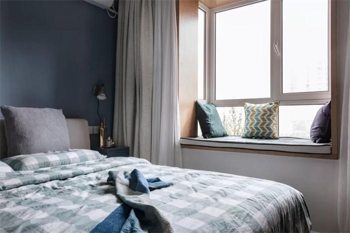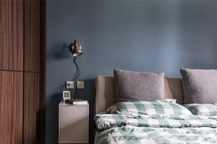 ▲臥室背景墻以藍(lán)色為主,布藝床頭靠墊,搭配一款青藍(lán)白的格紋床單,溫馨舒適。