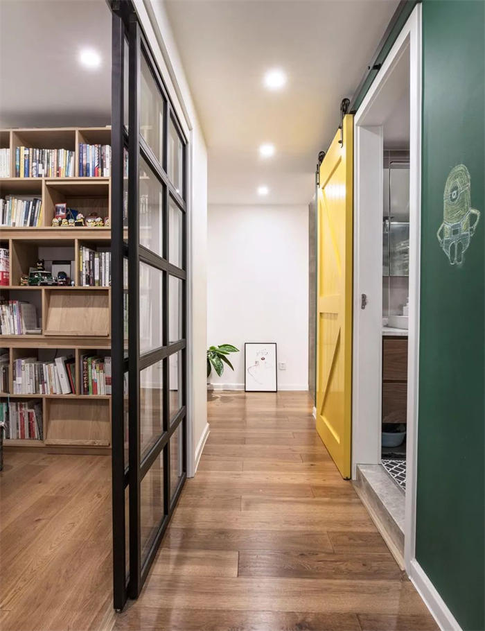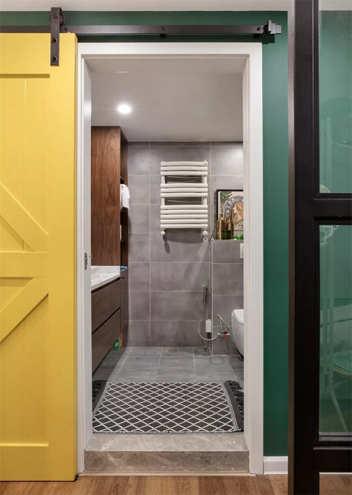 ▲衛(wèi)生間門(mén)外在深綠色的墻面基礎(chǔ)下,裝上一扇黃色的谷倉(cāng)門(mén),以鮮明的對(duì)比色,裝出一個(gè)藝術(shù)文藝的視覺(jué)感。