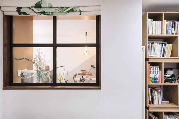 ▲這個(gè)室內(nèi)窗,連接了客廳區(qū)域,讓書(shū)房的光線也可以進(jìn)入客餐廳區(qū)域。