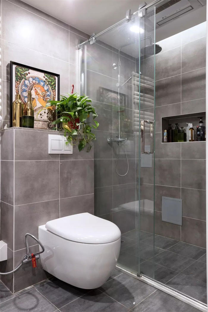 ▲衛(wèi)生間區(qū)域的的墻面地面都以灰色仿古磚張貼,一個(gè)干濕分離的推拉門(mén),讓空間顯得簡(jiǎn)約而又大氣。淋浴房側(cè)邊做了個(gè)壁龕,上面可以方便地存放洗浴用品。