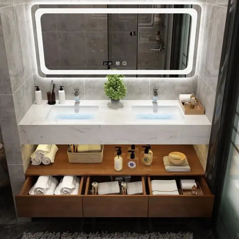 浴室柜的懸空最好做30cm,這樣浴室柜下面的空間也可以利用。擺放一些收納筐之類的特別方便,打掃的時候直接拿走就好了。