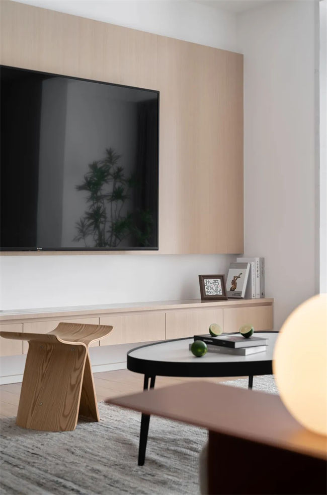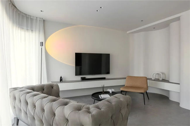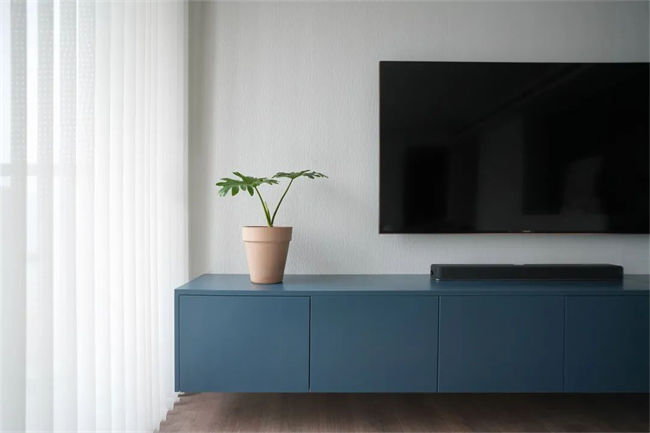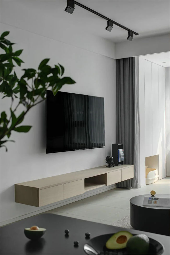 相比于常規(guī)的電視柜,懸浮設(shè)計的電視柜更加簡約大方。最常見的就是一字形柜,將插座、電線等隱藏在其中,將空間的高級感拉滿。
