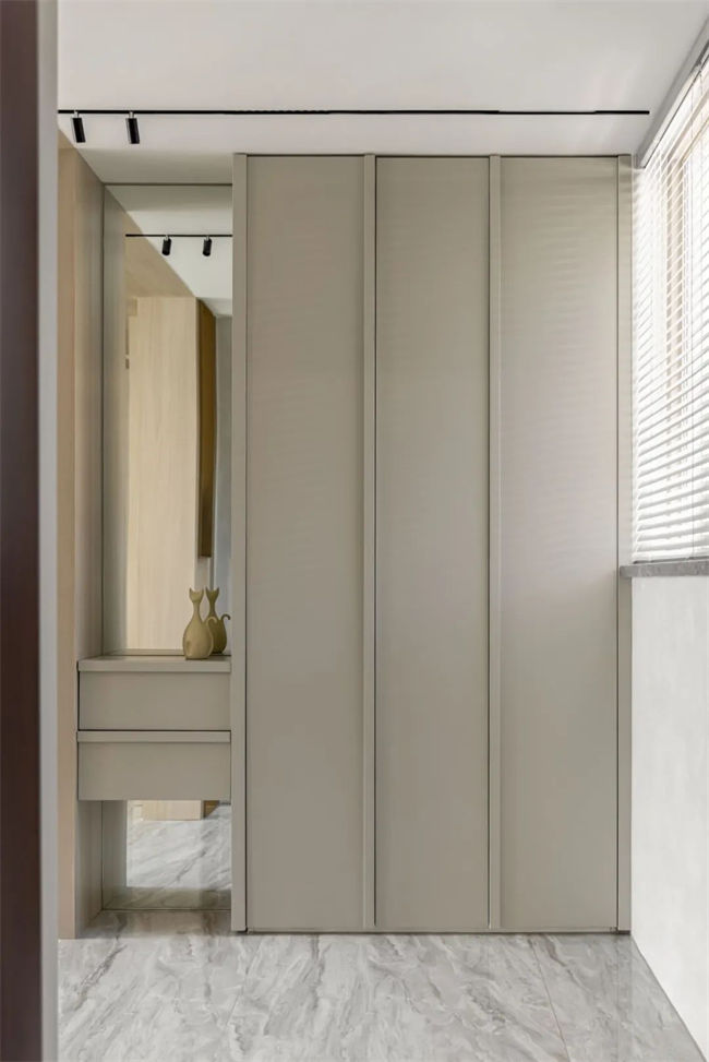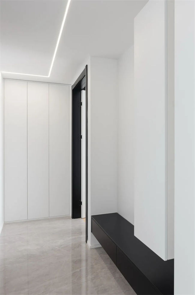 將玄關(guān)柜做成懸浮式設(shè)計,既保證了足夠的收納空間,下方懸空的區(qū)域還可以放置出入常穿的鞋子,清潔起來也很方便。加入隱藏式的燈帶設(shè)計,生活更有氛圍感。