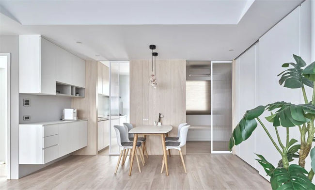 懸浮式設(shè)計的餐邊柜,空間占比更小,頂部做通頂設(shè)計,收納效果同樣很強大。沒有了遮擋,掃地機器人也能來去自如。