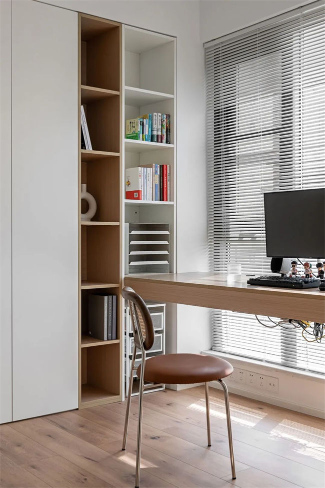 懸浮設(shè)計的書桌一般與衣柜或榻榻米相組合,既不會過多占用空間,也能輕松滿足閱讀與收納的雙重需求。