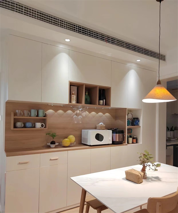 顧名思義,就是將餐邊柜嵌入墻壁內(nèi),使其和墻面平齊,相對(duì)來(lái)說(shuō),比較節(jié)省空間。