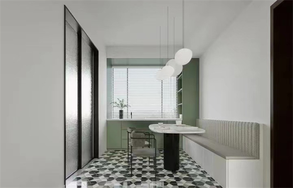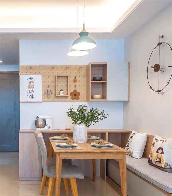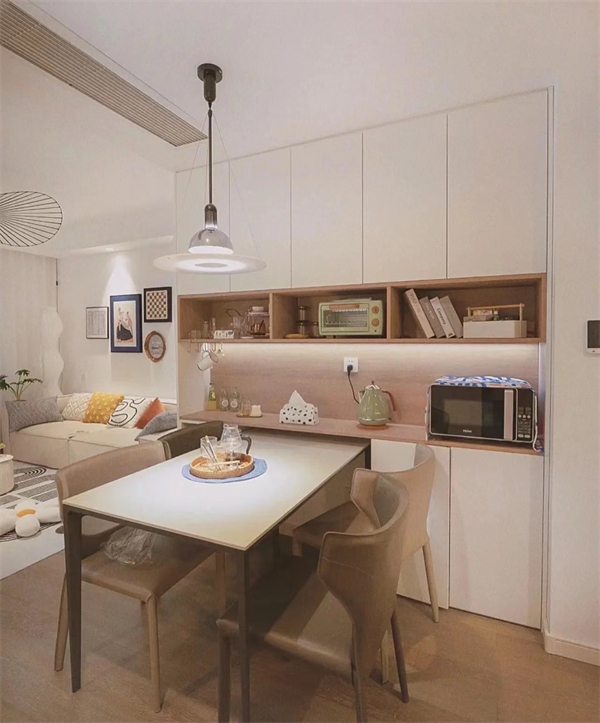 餐廳面積太小的情況下,可設(shè)計(jì)成卡座+餐邊柜的形式,不占用空間,同時(shí)卡座下方還能作為收納空間使用,大小戶型通用“神器”。