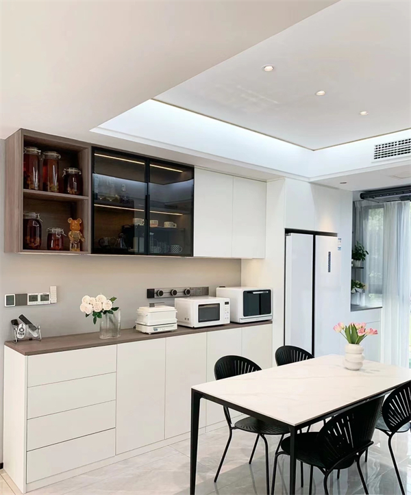 一些小家電可以放在餐邊柜的開(kāi)放層里,方便直接使用,無(wú)需跑進(jìn)廚房,比如:電飯鍋、微波爐等。