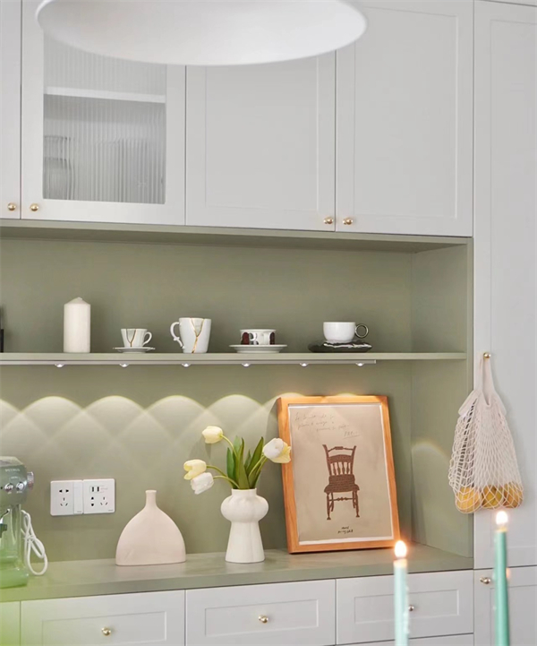 在定制餐邊柜的時(shí)候,不要給餐邊柜全裝上柜門(mén),要在餐邊柜中間加上開(kāi)放層,有了開(kāi)放層就可以放置一些常用的物品,同時(shí)在開(kāi)放層上也可以擺上裝飾品,增加餐廳空間的設(shè)計(jì)氛圍。