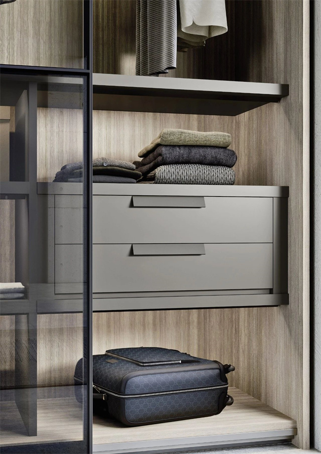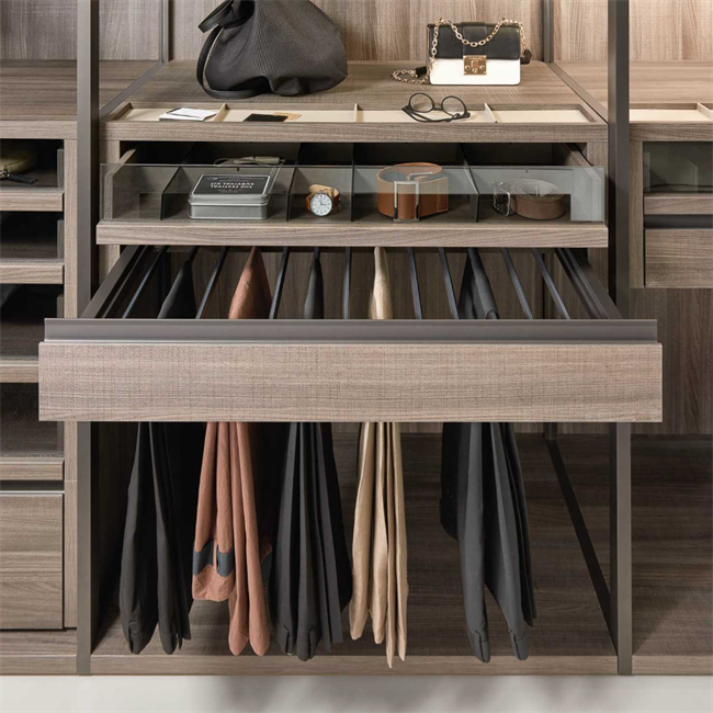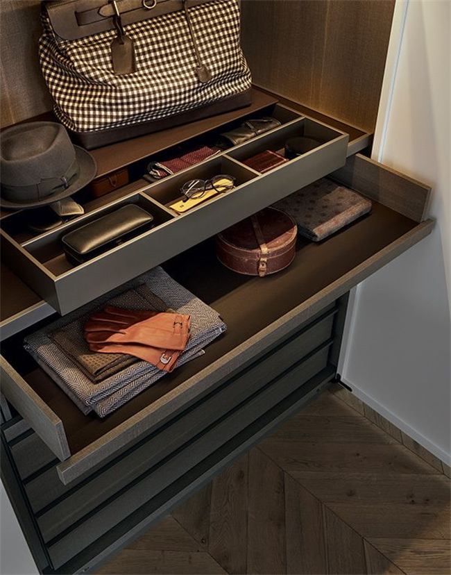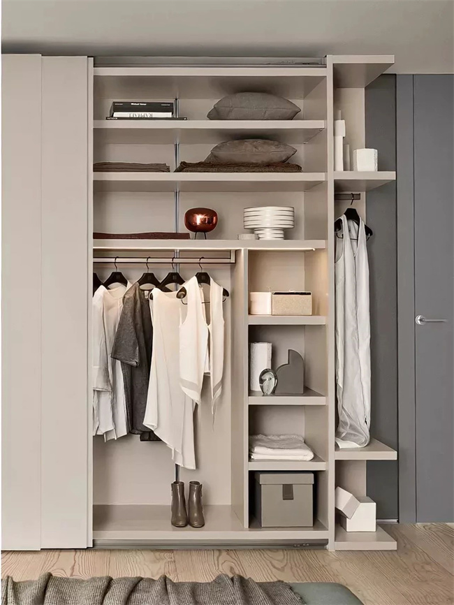 在衣柜分好掛衣區(qū)、疊放區(qū)、抽屜區(qū),根據(jù)不同的分區(qū)存放不同長(zhǎng)短、類型的衣物,再安裝功能五金抽屜件,用來(lái)收納各種小飾品,拿取更便捷,歸位也更方便。