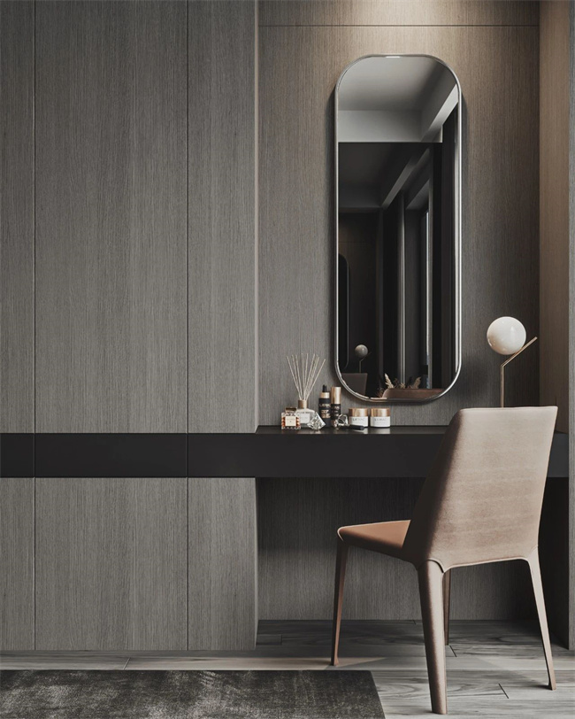 除了最基本的儲(chǔ)物功能外,還可以定制一個(gè)內(nèi)嵌式化妝臺(tái),用來(lái)收納各種化妝品、護(hù)膚品,把常用的物品都放這里,頻繁拿取也非常便利,而且還不占地方。