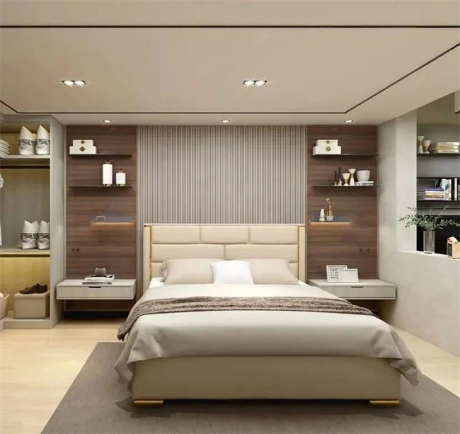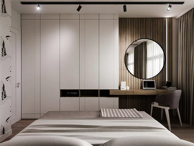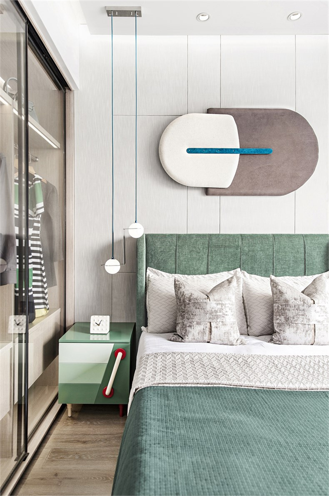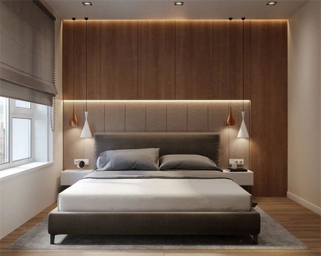 嵌入式床頭把柜子和床頭相連,上方再打一排柜子,整個(gè)空間就被利用起來(lái)了。不過(guò)要注意的是,設(shè)計(jì)的時(shí)候要保證床頭顏色和柜子顏色的統(tǒng)一。