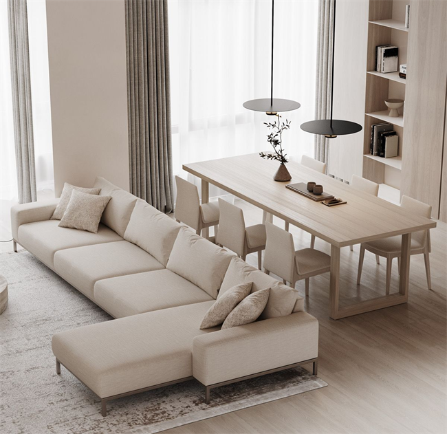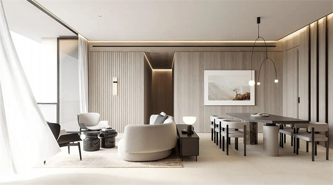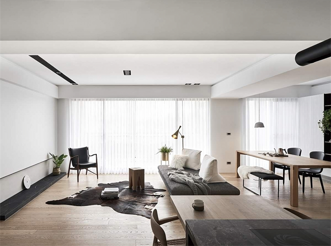 在一些大面積客廳或客餐廳不分區(qū)的戶型中,沙發(fā)的大體積與長條形可以完美的充當(dāng)隔斷使用來劃分空間,還能保持空間的通透性。