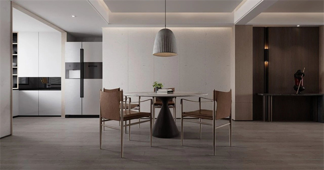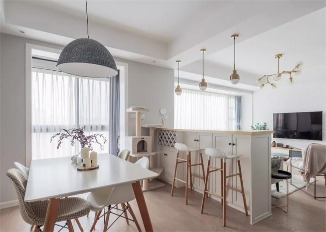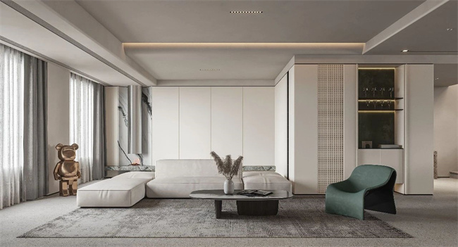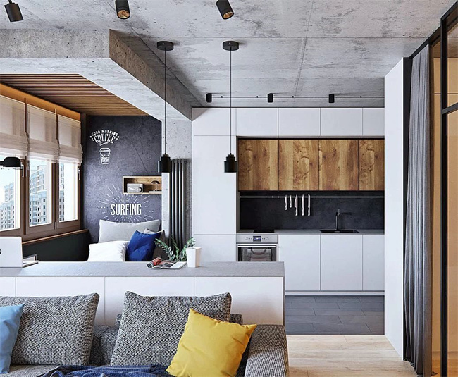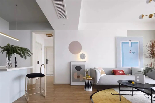 局部吊頂:梁體處于兩個空間的交界處,可以做個高低錯開的頂面,部分區(qū)域吊頂,美化橫梁又不會壓縮層高,還能夠更好地區(qū)分空間。