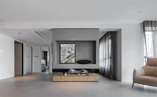 橫梁底部規(guī)劃背景墻,既提高整體設(shè)計感,又弱化橫梁存在。為了保持視覺通透,減少壓迫感,背景墻建議采用半墻設(shè)計。