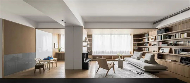 如果橫梁處于客廳與其他空間的交界位置,無需進(jìn)行過度處理,直接作為空間的軟隔斷,保持空間的原始層高,開闊敞亮。同時這還能夠免去天花的設(shè)計,省錢又省力。