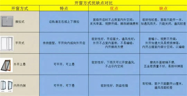 常用的有4中開窗方式:推拉式、平開窗、外開上懸、內(nèi)開內(nèi)倒。一般家里使用推拉式、平開式的開窗方式比較多,具體優(yōu)缺點對比可參考下圖。