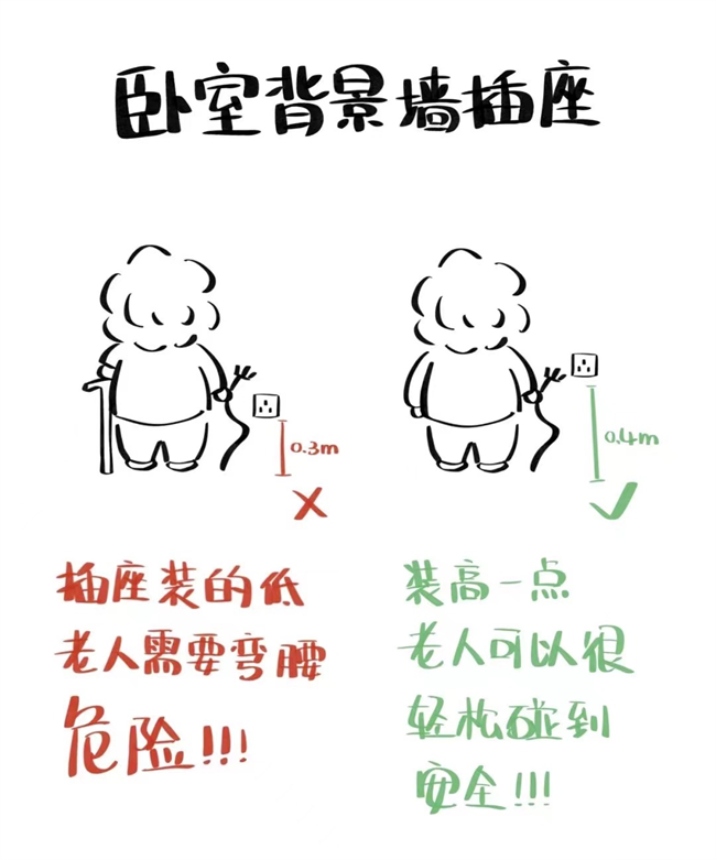 建議把插座位置從正常的0.3m處調(diào)整到離地面0.4m處,老人就可以輕松插座啦~