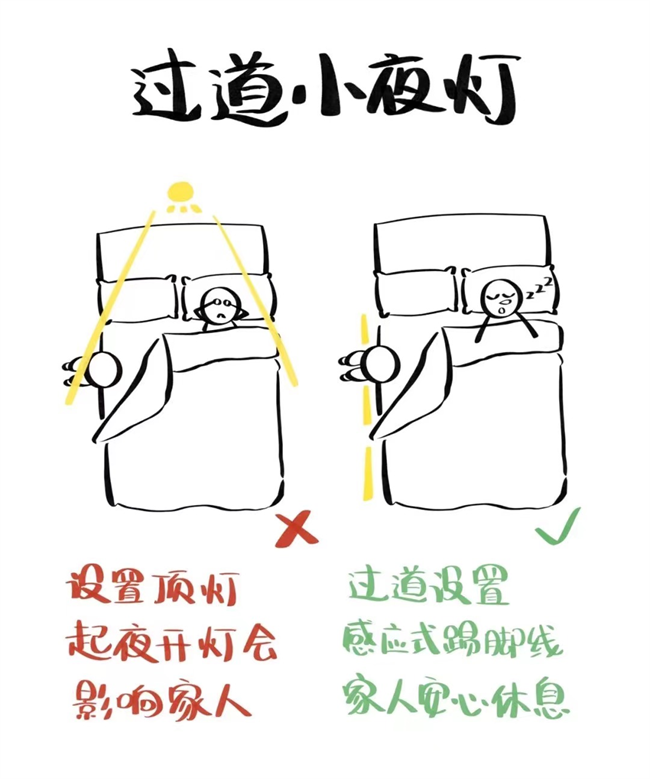 如果在床下和過(guò)道安裝感應(yīng)式的小夜,不影響家人的同時(shí)還可以清晰的看到周?chē)穆肪€,燈光也會(huì)柔和非常多。