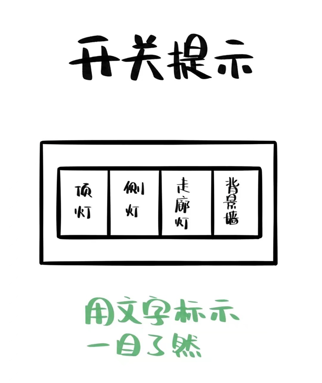 開(kāi)關(guān)面板上,可以用文字標(biāo)示開(kāi)關(guān)相應(yīng)控制區(qū)域,開(kāi)哪個(gè)燈一目了然。