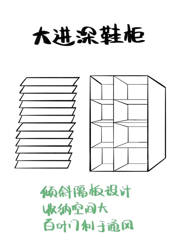 多隔層、大進(jìn)深、傾斜隔板設(shè)計(jì)的鞋柜收納空間更大,另外玻璃磚的透光性更好。