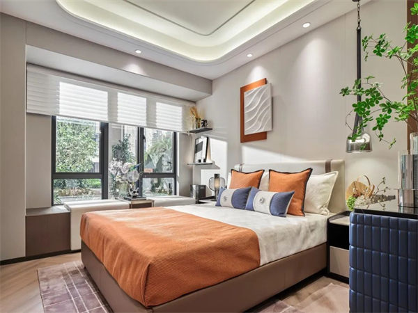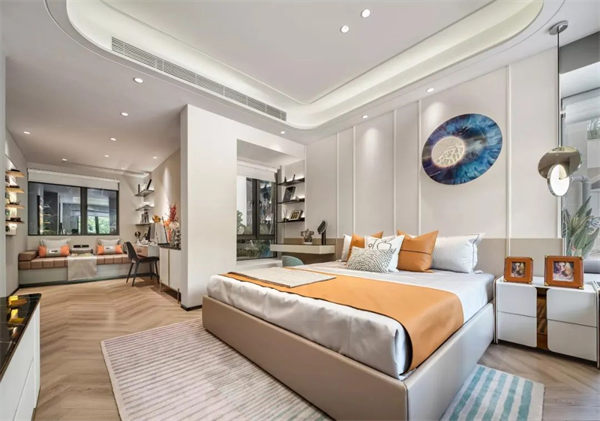 設(shè)計(jì)建議:將臥室空調(diào)安裝床尾側(cè)方的墻面上,這樣空調(diào)風(fēng)會從側(cè)面或者通過室內(nèi)立面的反彈轉(zhuǎn)吹到床上,整體的風(fēng)力比較舒適柔和。