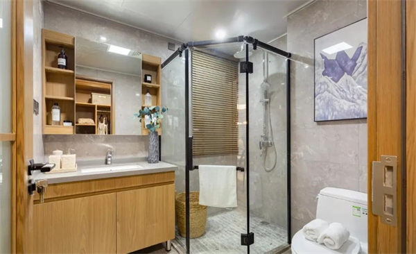 設(shè)計(jì)建議:將衛(wèi)生間的干區(qū)外置,使用淋浴區(qū)和馬桶區(qū)域的時(shí)候,也不會影響到外面的洗漱區(qū)域。在淋浴區(qū)安裝玻璃門淋浴房,使用方便,也不用擔(dān)心水汽會影響到其他區(qū)域。