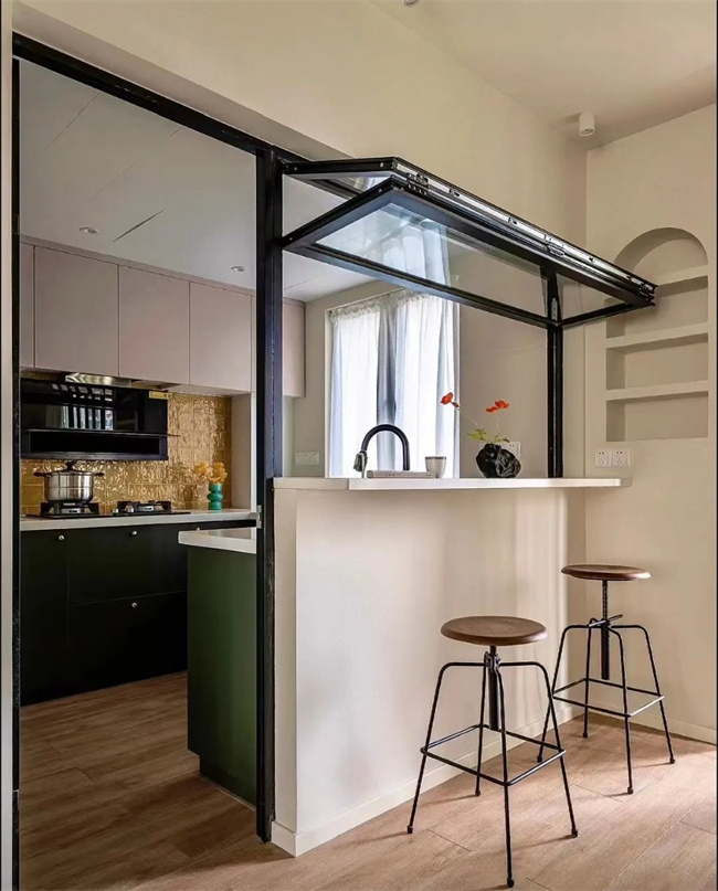 室內(nèi)玻璃門窗,絕對是小黑屋的終極解藥。室內(nèi)窗優(yōu)化了餐廚動線,做飯的人不用一直進(jìn)出廚房,通過窗戶遞出去,或放在半墻吧臺上,減少了地面水漬、油漬帶到客餐廳的煩惱。