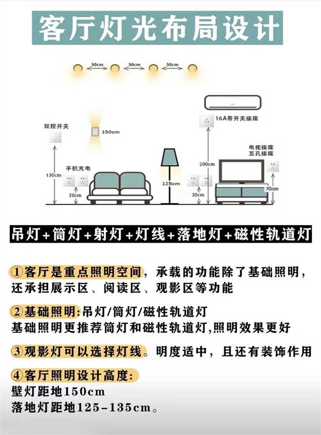 客廳按每平米2.5~3W來計算,搭配吸頂燈或筒燈/射燈。吸頂燈安裝在沙發(fā) - 電視區(qū)的正中間,或茶幾正上方。如果裝射燈,有一盞要照向茶幾,但不能讓燈直接照向電視,否則會反光。